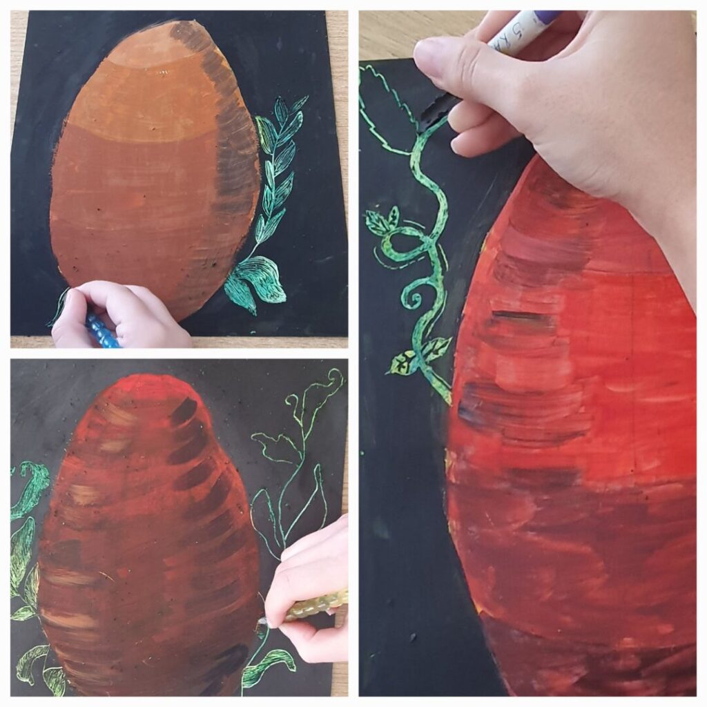 U Učeničkoj zadruzi „Jabuka“ proteklo je razdoblje bilo u znaku očuvanja lokalne baštine i kreativnog rada. Mladi zadrugari proučavali su bogatstvo šara i ukrasa tradicionalnih pisanica cetingradskog kraja, diveći se umijeću naših starih. Kroz istraživački rad učenici su naučili: Prirodno bojanje: Kako su se jaja nekada bojala prirodnim putem, najčešće pomoću lupina od luka koje daju specifične zemljane tonove. Grafičke tehnike: Teorijski smo se upoznali s tehnikom suhe igle, proučavajući kako se preciznim urezivanjem linija u tvrdu podlogu stvaraju detaljni crteži i bogate teksture. Stečeno znanje o tradicijskim motivima i važnosti precizne linije učenici su potom praktično primijenili koristeći tehniku grataž. Sami su pripremali papire nanoseći slojeve podloge, a zatim su struganjem gornjeg sloja „izvlačili“ tradicijske šare na vidjelo. Rezultat ove kombinacije istraživanja i praktičnog rada je izložba radova na školskom panou, kojom smo na moderan način odali počast običajima našeg zavičaja.
